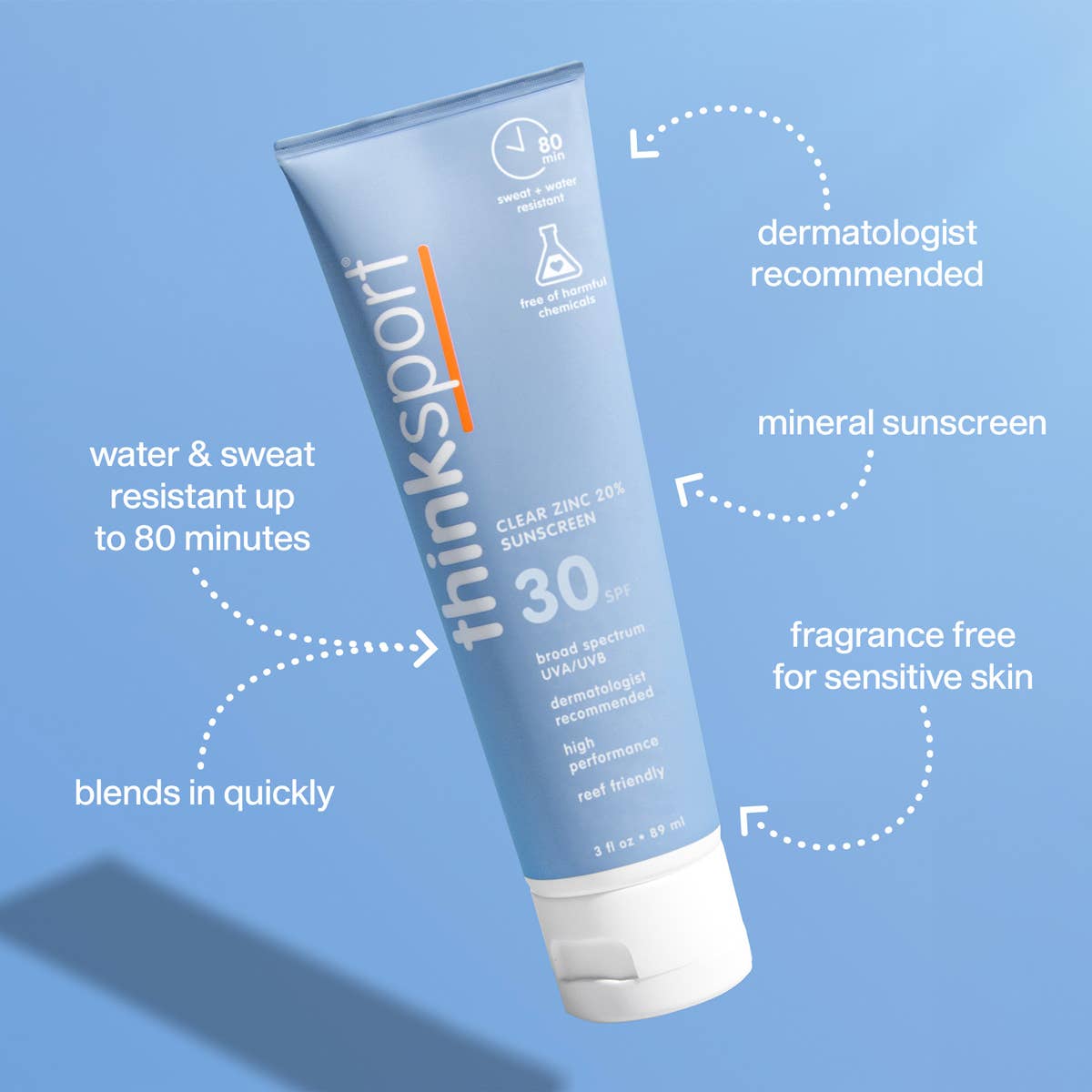 Receive ultimate broad-spectrum protection from damaging UVA and UVB sun rays with this lightweight, dermatologist recommended formula. ThinkSport SPF 30 Clear Zinc Sunscreen provides comfortable, sweat resistant, sheer coverage for 80 minutes. Our science-backed sunscreen is reef friendly. What it does *Clear Zinc Oxide dries sheer (little to no white cast) *Water and Sweat Resistant (80 minutes) *Non-greasy application *High endurance and performance formula *Reef friendly *Vegan *BPA friendly What is in it *Clear Zinc Oxide: non-nano mineral sunscreen blocks and protects skin from UV sun rays *Cooling Aloe, conditioning Vitamin E & nourishing Jojoba Oil infuse skin with soothing moisture What’s not in it *Free of biologically harmful chemicals *Free of parabens, phthalates, and other toxic chemicals